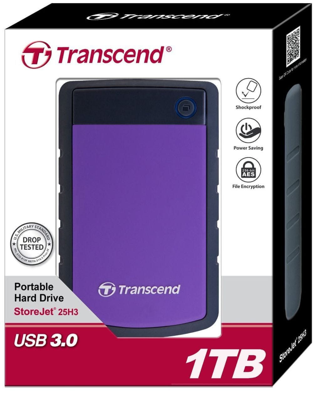 S prelepim črnim in vijoličnim okvirjem, ima eleganten Transcend StoreJet 25H3 prenosni USB trdi disk dovolj veliko kapaciteto za vaše digitalne vsebine. Disk se napaja preko USB kabla ter Store Jet Elite programske opreme. Podatke prenaša preko USB 3.0, kjer hitrost prenašanja naraste do 5 Gb/s, obenem pa je popolnoma kompatibilen z USB 2.0.