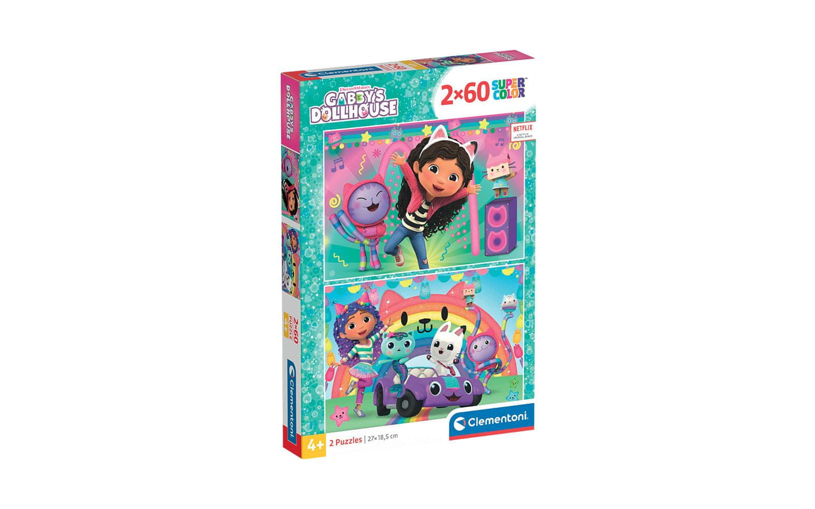 Dve sestavljanki s po 60 sestavnimi deli priporočamo otrokom starejšim od 4 let. Sestavljanke Supercolor Clementoni spremljajo otroka v vseh fazah razvoja in mu pomagajo razvijati ročne spretnosti ter sposobnost opazovanja. Kakovost materialov in posebna tehnika tiskanja zagotavljata vedno lepe, žive in jasne barve za igro, ki ji ni nikoli konca. Motiv Gabbys dollhouse.