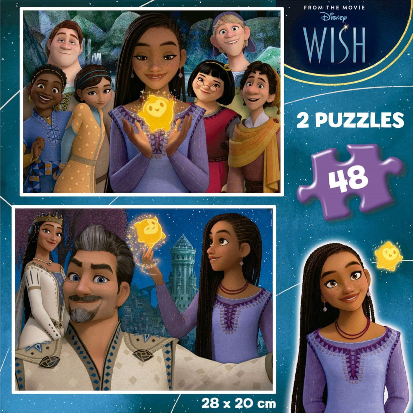 Paket vsebuje dve sestavljanki z enakim številom kosov in enake velikosti. Velikost sestavljene sestavljanke je približno 28 × 20 cm.
