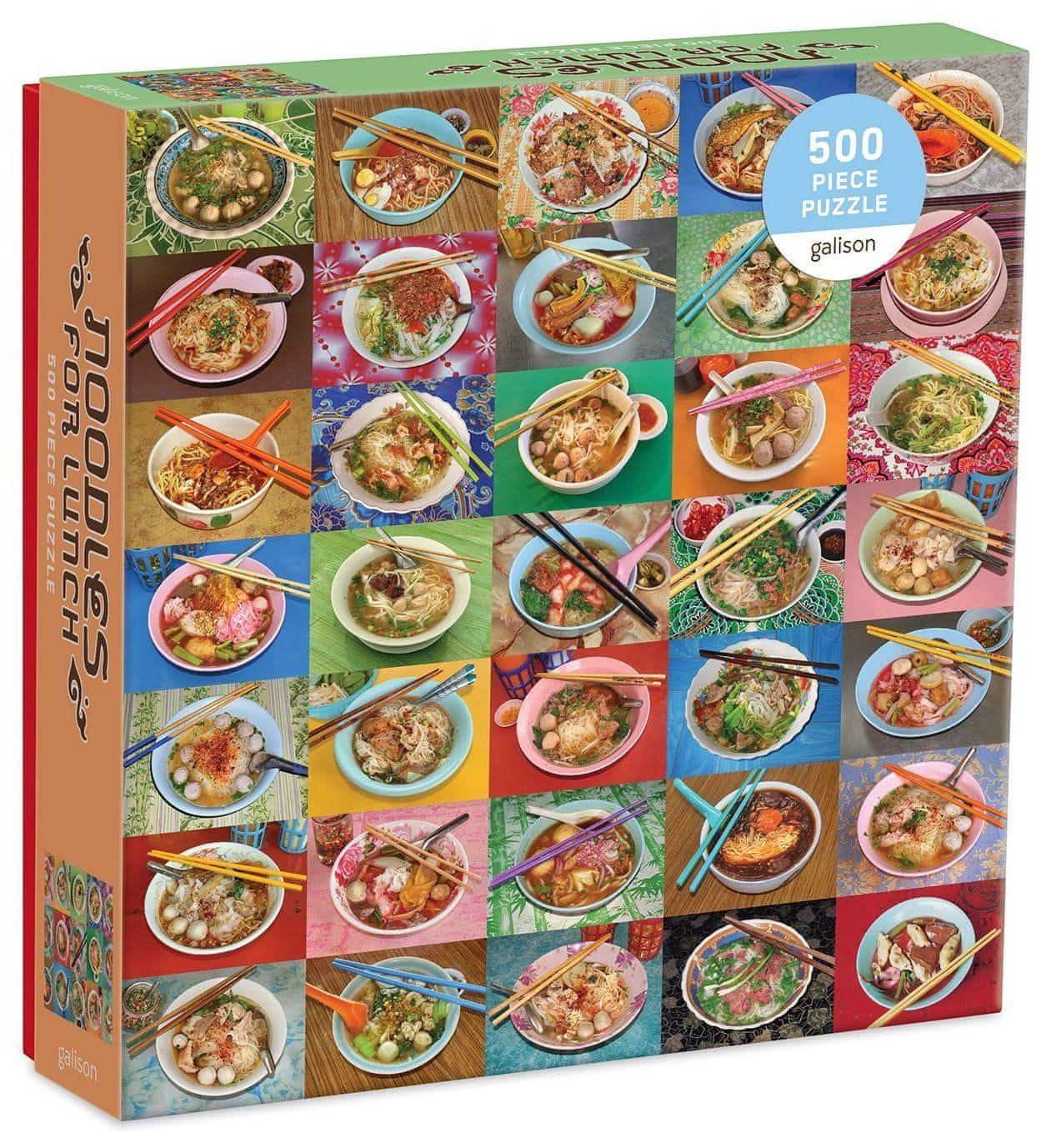 Sestavite to sestavljanko iz 500 delov, da odkrijete 35 barvitih slik okusnih jedi iz rezancev iz jugovzhodne Azije, ki jih je fotografiral (in pojedel!) oblikovalec in svetovni popotnik Troy Litten. Očarljivnabor skled, palčk, žlic, začimb in namiznega pribora je slasten izziv, ki se ga je najbolje lotiti s polnim želodcem. Sestavljanka je zapakirana v trpežne škatle z matiranim zaključkom. Glavne značilnosti:Vsebuje 500 kosovPotiskano z nestrupenimi črniliPremium kakovostna sestavljankaPopolno prileganje posameznih kosovRazvija logično mišljenje in motorične spretnosti