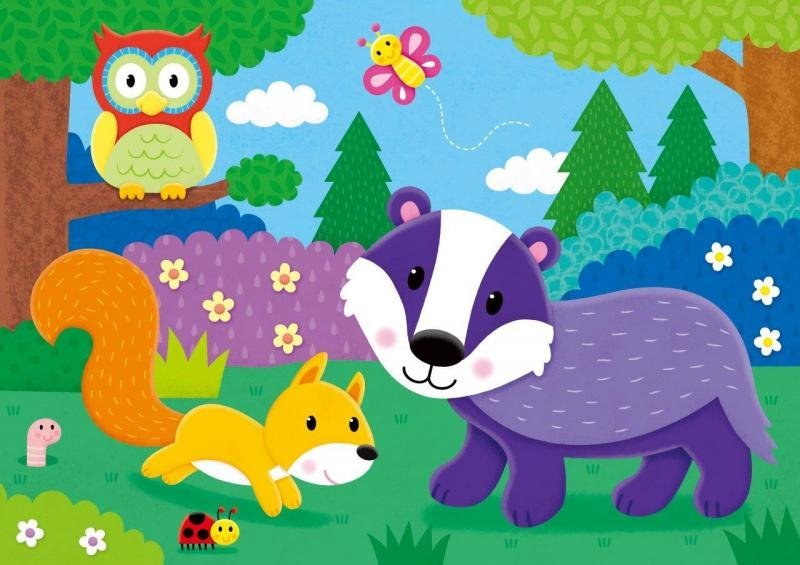 Sestavljanka v praktičnem kovčku s postopnimi deli. Paket vsebuje štiri različne slike z motivom gozdnih živali, vsaka z različnim številom koščkov. Sestavljanka pomaga razvijati logično mišljenje in vaditi potrpežljivost. Priložena je v kartonski škatli s priročnim plastičnim ročajem za lažje prenašanje. Velikost zložene sestavljanke približno 21 × 15 cm