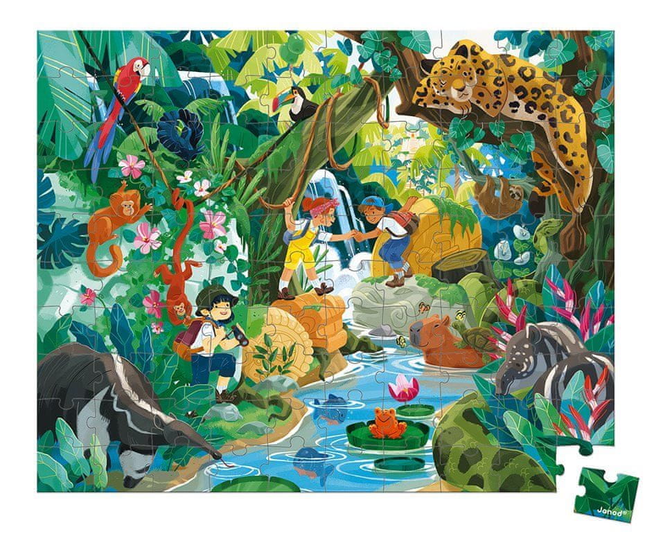JANOD Jungle Puzzle – Raziščite džunglo in s prijatelji poiščite skriti inkovski tempelj! Te 100-delne kartonske sestavljanke bodo zagotovo očarale in zabavale marsikaterega malega otroka. Sestavljanke razvijajo logično mišljenje, pozornost, spomin, domišljijo, fino motoriko, hkrati pa se otroci učijo zaznavati odnos med deli in celoto. Sestavljanka je pakirana v izvirnem in praktičnem kovčku, ki je primeren za domačo uporabo, pa tudi za potovanja, vključno s plakatom, ki služi kot predloga. Ročaj iz blaga omogoča enostavno prenašanje. dimenzija zložene sestavljanke približno 50 × 40 cm
