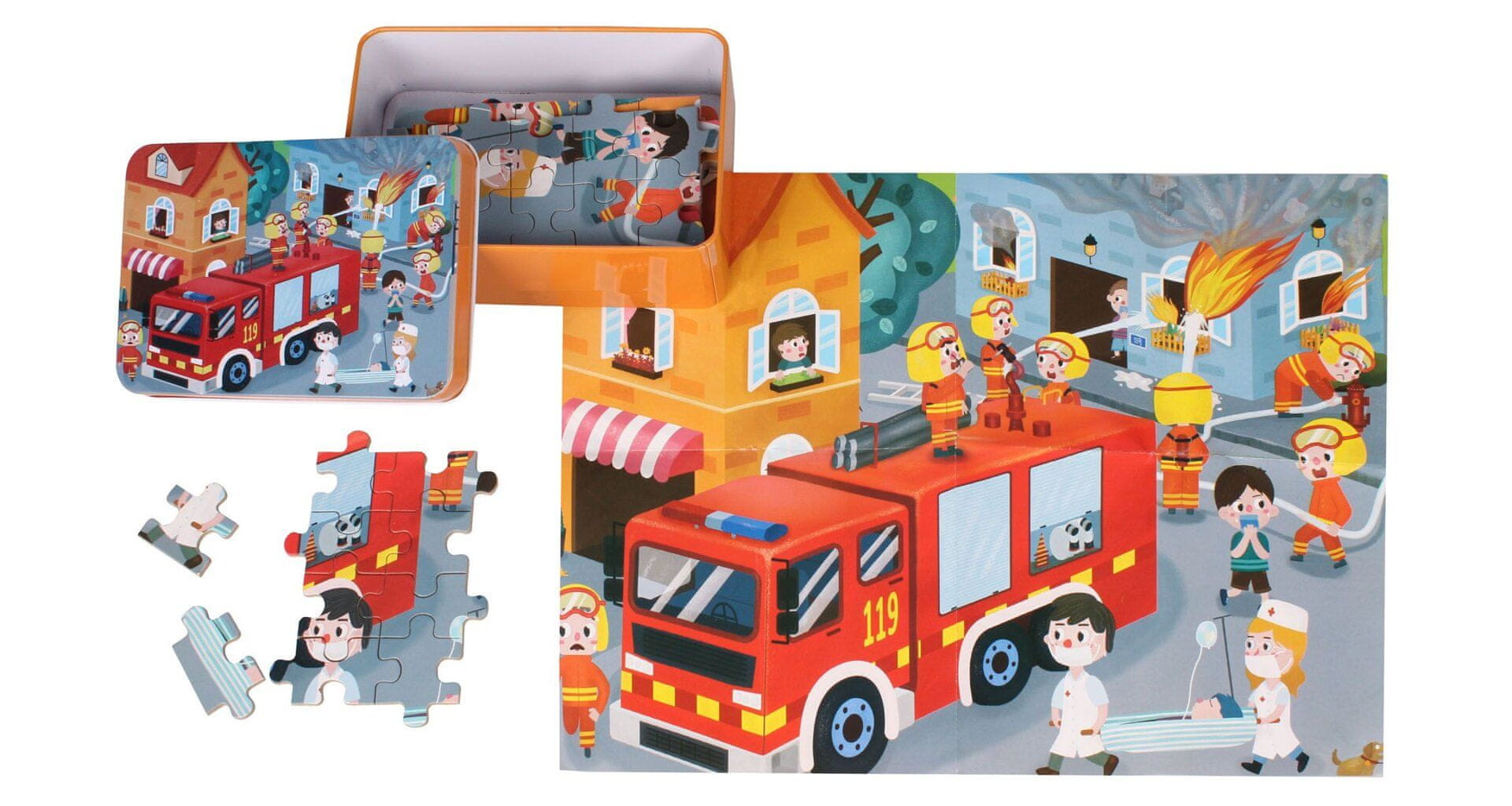 Sestavljanka za otroke 100 kosov s sliko gasilskega vozila. Starost 3+ praktična kovinska škatla. Celoten opis