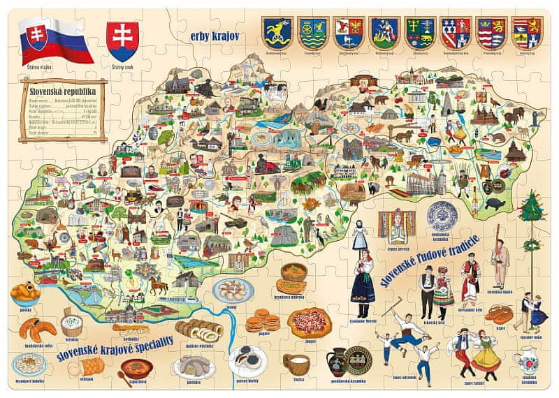 Geografska sestavljanka za otroke z zemljevidom Slovaške republike in ilustracijami umetnice Hane Vavrinove. Na zemljevidu boste našli ljudske običaje, regionalne posebnosti, zastavo ali državni znak in druge koristne informacije. Vsa besedila na zemljevidu so v slovaškem jeziku. Zlaganje pisanih delov razvija otrokovo opazovanje, spretnost in koncentracijo. Poleg tega slike, ki predstavljajo živali, rastline ali zgradbe, spodbujajo domišljijo najmlajših in jim pomagajo prepoznati stvari, ki so značilne za Slovaško. Velikost sestavljene sestavljanke je približno 67,5 × 47,5 cm