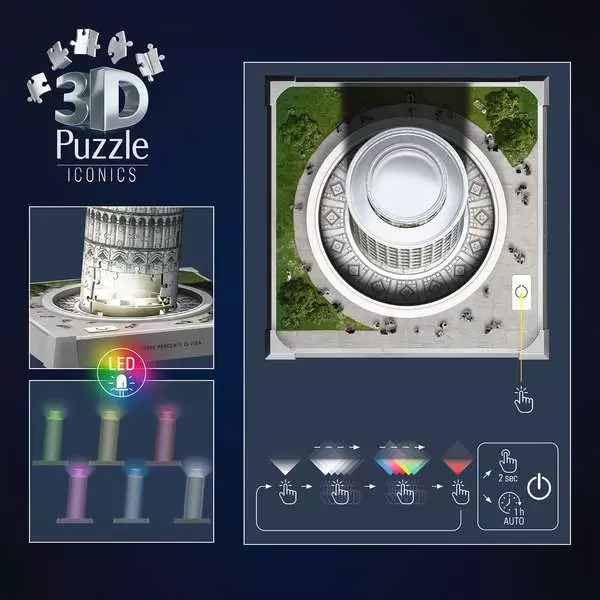 Ravensburger 3D puzzle Iconics: poševni stolp v Pisi (nočna izdaja) 216 kosov