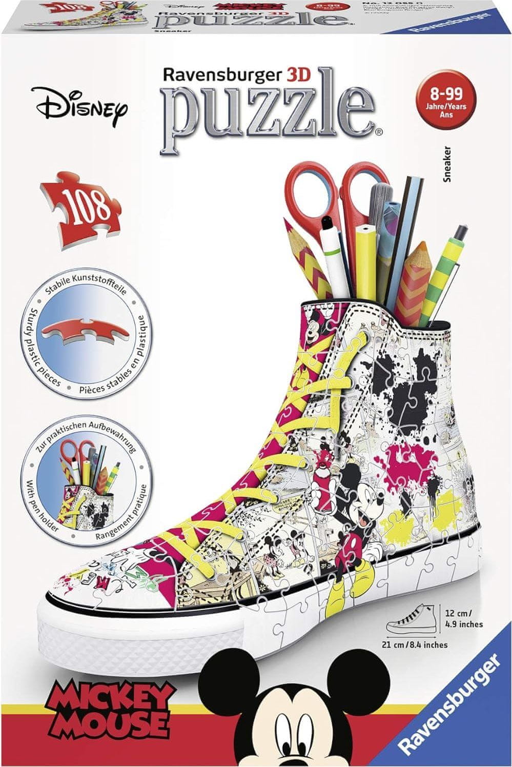 Odlična kombinacija za ljubitelje športnih copat in pregibanja! Sestavite 3D sestavljanko nove oblike, ki bo popestrila vašo mizo … Podjetje RAVENSBURGER se je lotilo izdelave 3D-steznikov, ki jih lahko uporabite kot izvirna držala za pisala, barvice ali celo čopiče. Posebni ukrivljeni ali prožni deli, ki se natančno prilegajo na svoje mesto, vam omogočajo izdelavo dizajnerske superge. Deli so izdelani iz trdne plastike in zagotavljajo odlično stabilnost. Skelet se prilepi, ne da bi ga bilo treba lepiti. Paket vsebuje: 108 oštevilčenih delov sestavljanke, 4 dodatne dele in navodila. Opozorilo: vsebina športnega copata, prikazana na fotografiji, ni vključena. Dimenzije sestavljene sestavljanke približno 21,4 × 13,5 cm.