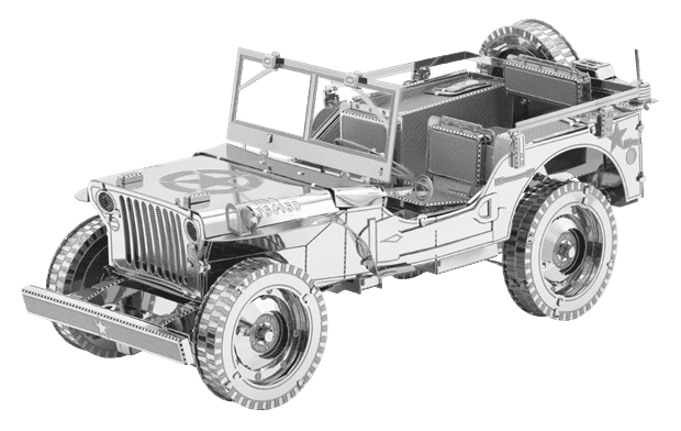 Vznemirljiv izziv, razburljiva izkušnja zlaganja in osupljiv rezultat – to so modeli METAL EARTH! Ta model iz vrhunske serije ICONX v ekskluzivnem darilnem paketu vas bo navdušil s še več podrobnostmi! Gradnja 3D sestavljank METAL EARTH ICONX zahteva potrpežljivost in spretne roke. Vendar pa rezultat dela v celoti nadomesti vloženi trud! Miniaturne replike so še posebej impresiven in privlačen okras ne le doma, temveč tudi v pisarni ali šoli. Pravokotni kosi jekla (21 × 11 cm) z deli svetovnih spomenikov, znanih vozil, glasbil ali živali bodo pod vašimi rokami zrasli v podrobne in fascinantne modele. Pristen videz 3D sestavljanke METAL EARTH ICONX je dosežen s podrobnim laserskim graviranjem. Paket vsebuje 2 jekleni rezini, pinceto in navodila za sestavljanje. Orodja niso vključena. DELOVNI POSTOPEK. Kljun upognite z majhnimi tankimi kleščami (niso priložene) in postopoma povežite vse ključavnice, dokler ne ustvarite zelo realistične mojstrovine! Priporočena starost: 14 let in več. Jeep Willys MB je bilo ameriško lahko uporabno vozilo, ki so ga izdelovali med drugo svetovno vojno. Ime jeep (češko: džíp) je po vsem svetu postalo sinonim za terensko vozilo. To legendarno vozilo je bilo morda najbolj znano vozilo druge svetovne vojne. Več na Wikipediji Dimenzije sestavljene sestavljanke približno 9,7 × 3,8 × 4 cm