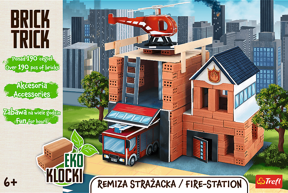 Stani graditelj in zgradi svoj gasilski dom iz pravih glinenih opek in lesa! Zlagajte opeko za opeko, režite in lepite deske, napredujte od temeljev do dokončane stavbe in na koncu okrasite svojo stvaritev s priloženimi okraski. Gradite korak za korakom po navodilih ali pa poiščite in izvedite svojo rešitev. Dokončano stavbo oživite s papirnatimi figuricami. Če združite več kompletov TREFL Brick Trick, lahko ustvarite slikovito vasico, sodobno mesto ali srednjeveško naselje. Komplet lahko uporabite večkrat (lepilo je topno v vodi). Paket vsebuje. Primerno za otroke, stare 6 let in več. Izdelano v EU.