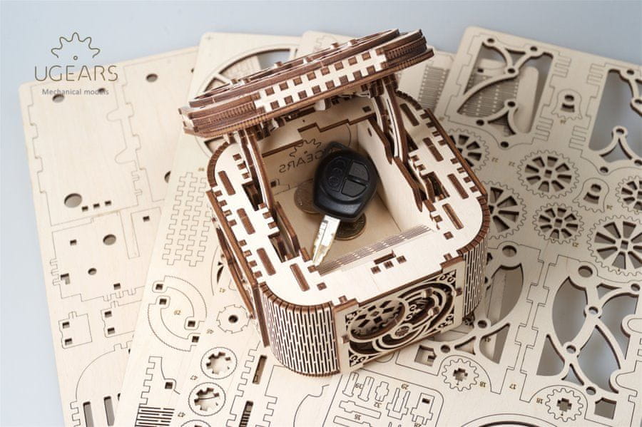 Mehanski dragulj. Škatlica za nakit iz vezanega lesa. Očarala vas bo z izrezljanim pokrovom in stranskimi okenci, ki razkrivajo očarljivo globino njene mehanske skrivnosti. Ob odpiranju se vam odpre majhna uganka, s katero lahko popestrite darilo z visoko realno ali sentimentalno vrednostjo. Z zasukom pokrova sprostite neopazen ključ, ki ga vstavite v sprednjo stran škatle za nakit, nato pa ga obrnite, da se škatla odpre. V kompletu s podrobnimi navodili za sestavljanje. Glavne značilnosti: 190 natančno izrezanih kosovsrednje zahtevno sestavljanjeprostor za shranjevanjeoblikovano in izdelano v Ukrajini