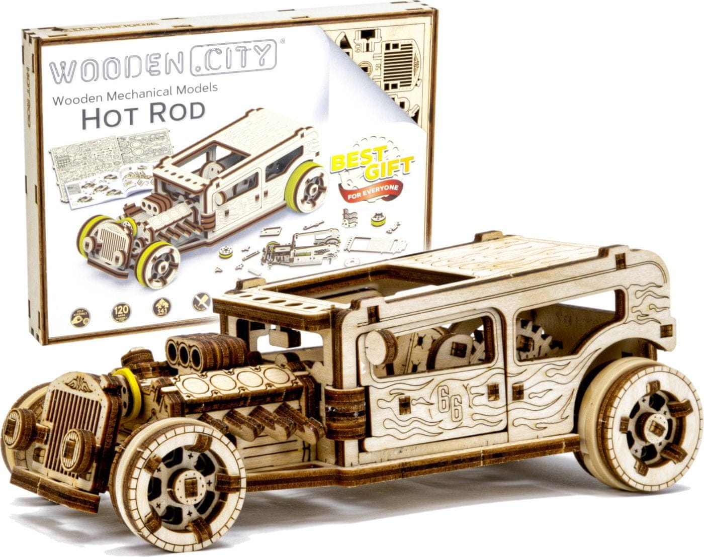 Klasični ameriški avto Hot Rod z velikimi motorji, prirejenimi za večjo hitrost. Ta model ima nekaj zanimivih podrobnosti, kot so vrata, ki se odpirajo z ustavitvijo, in registrsko tablico kot pravi avto! Naš leseni Hot Rod ima celoten nabor funkcij za premikanje, če pa na ta avtomobil pogledate od zgoraj skozi streho, boste videli tudi podroben motor, dvojni sedež in prestavno ročico. In seveda, zaradi čudovitega dizajna boste Hot Rod vzljubili! Model ima več podrobnosti pravega avtomobila: – vrata, ki se odpirajo z zaustavitvijo, – registrsko tablico, – sprednja vrtljiva kolesa, – mehanizem vztrajnika, – obračalna kolesa, – podroben motor, – dvojni sedež, – prestavno ročico. Težavnost: 3 od 5 (glede na oddelek Wooden City) Približni čas sestavljanja: 2 uri Merilo: 1:32 3D sestavljanke WOODEN CITY so podrobni, funkcionalni mehanski modeli, ki se sestavijo brez lepila ali orodja. Izdelani so iz okolju prijaznih lesenih materialov – visokokakovostne vezane plošče iz breze. Z mehanskimi lesenimi sestavljankami WOODEN CITY se boste ure in ure zabavali ob njihovem sestavljanju ter od blizu spoznali zobnike, gumijaste motorje, zobniška kolesa in druge sestavne dele.
