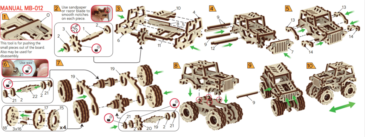 Merilo: 1:50 Zahtevnost: Enostavno Približni čas sestavljanja: 1 ura OPOMBA: Za pravilno delovanje in nemoteno delovanje je treba dele, kot so zobniki in osi, namazati z voskom iz katere koli sveče, da zagotovite gibanje z minimalnim trenjem.