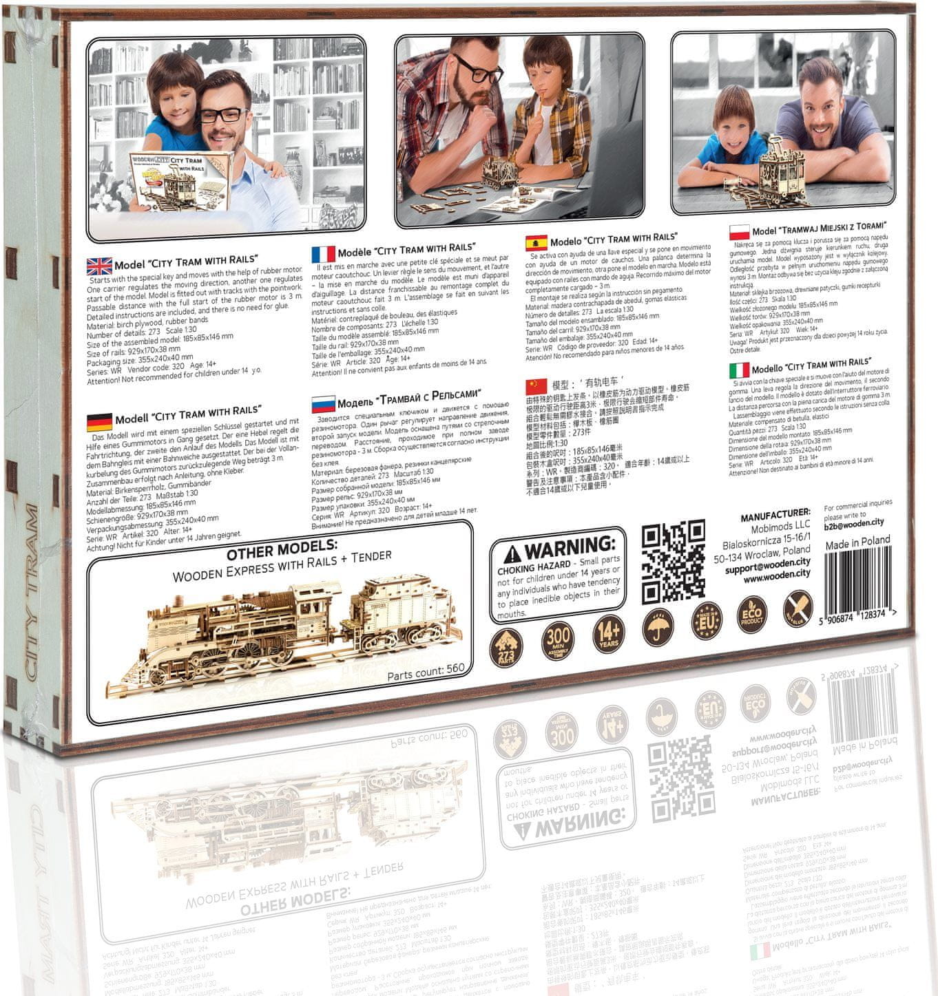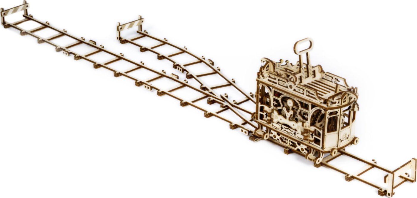 Ponosni smo, da vam lahko predstavimo naš novi mehanski leseni set – mestni tramvaj s tiri. Videti je kot pravi tramvaj, ki je na poti, da vam pokaže vse posebne kraje, ki jih želite videti v svojem najljubšem mestu. Model sestavite s prijatelji ali otroki, ga postavite na tire in uživajte v trenutku zabave in sreče. – zažene se s posebno tipko – premika se z gumijastim motorjem – nadzor smeri gibanja in zagona modela – prevožena razdalja pri polnem delovanju gumijastega motorja je 3 m – vozi naprej in nazaj 3D sestavljanka WOODEN CITY City Tramvaj s tiri je nenavadno darilo za vaše najdražje in ljubitelje sveta na tirih. Približni čas sestavljanja: 5 ur Merilo: 1:30 Dimenzije modela: 18,5 × 8,5 × 14,6 cm Dimenzije tirnice: 92,9 × 17 × 3,8 cm Lesene sestavljanke WOODEN CITY 3D so podrobni, funkcionalni mehanski modeli, ki se sestavijo brez lepila ali orodja. Izdelani so iz okolju prijaznih lesenih materialov – visokokakovostne vezane breze. Z mehanskimi lesenimi sestavljankami WOODEN CITY se boste ure in ure zabavali ob sestavljanju ter od blizu spoznali zobnike, gumijaste motorje, zobniška kolesa in druge sestavne dele.