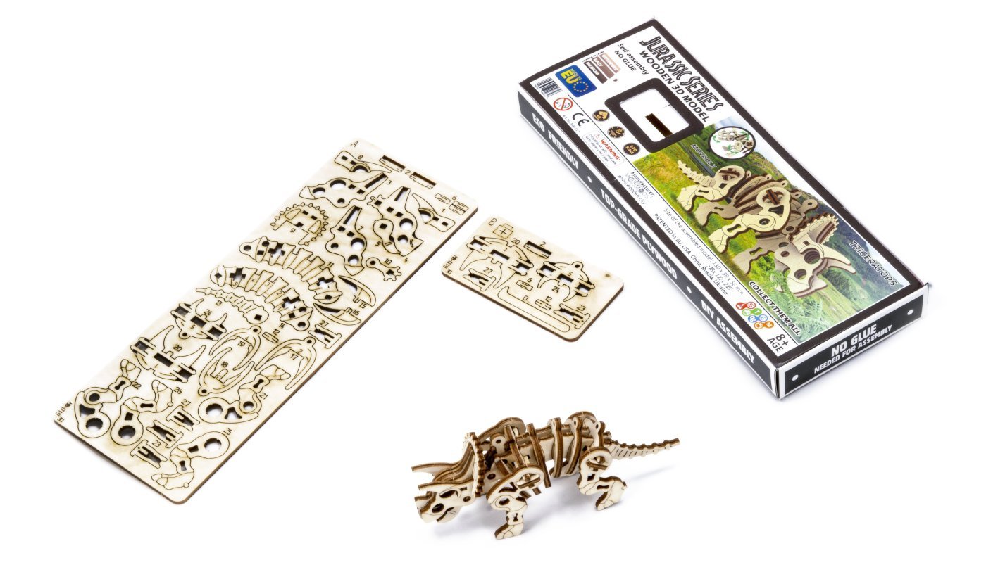 Leseni mehanski komplet iz serije Jurassic Triceratops je namenjen ljubiteljem prazgodovinskih bitij. Po sestavljanju model oživi v vaših rokah, saj ima premično glavo in okončine. Zaradi edinstvene zasnove in presenetljivih podrobnosti tega modela bo sestavljanje polno zabave. 3D sestavljanka WOODEN CITY Jurassic Series Triceratops je odlično darilo za vse ljubitelje dinozavrov. Težavnost: 2 od 5 (po podatkih podjetja Wooden City) Približni čas sestavljanja: 1 ura Merilo: 1:70 WOODEN CITY 3D lesene sestavljanke so podrobni, funkcionalni mehanski modeli, ki se sestavijo brez lepila ali orodja. Izdelani so iz okolju prijaznih lesenih materialov – visokokakovostne vezane breze. Z mehanskimi lesenimi sestavljankami WOODEN CITY se boste lahko ure in ure zabavali ob sestavljanju ter od blizu spoznali zobnike, gumijaste motorje, zobniška kolesa in druge sestavne dele.