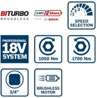 GDS 18V-1050 H Professional je zasnovan predvsem za kovinske aplikacije (M10–M24), kot so jeklene konstrukcije, montaža kovin, polaganje cevi, vzdrževanje tovornjakov in lesene konstrukcije. Ta izdelek je združljiv z vsemi Boschevimi 18V profesionalnimi baterijami in polnilniki (18V Professional System).