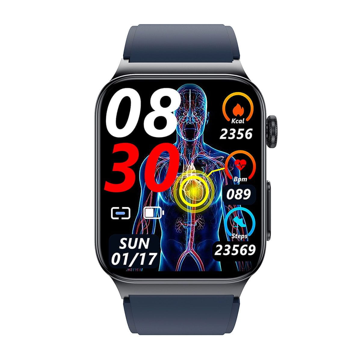 Pametna ura Cardio One je pametna ura, ki skrbi za vaše zdravje. Opremljena je z inovativnimi funkcijami za spremljanje zdravstvenih parametrov, kot so krvni tlak, glukoza, nasičenost, pulz in temperatura. Poleg tega ura Cardio One omogoča spremljanje vašega napredka in dosežkov ter služi za izboljšanje vaše telesne pripravljenosti in zmogljivosti s sledenjem korakov, razdalje in pokurenih kalorij. Ura je opremljena z zaslonom visoke ločljivosti, ki vam omogoča priročen pregled obvestil in aplikacij. Njena pravokotna oblika zagotavlja večjo površino zaslona v primerjavi s tradicionalnimi okroglimi urami.