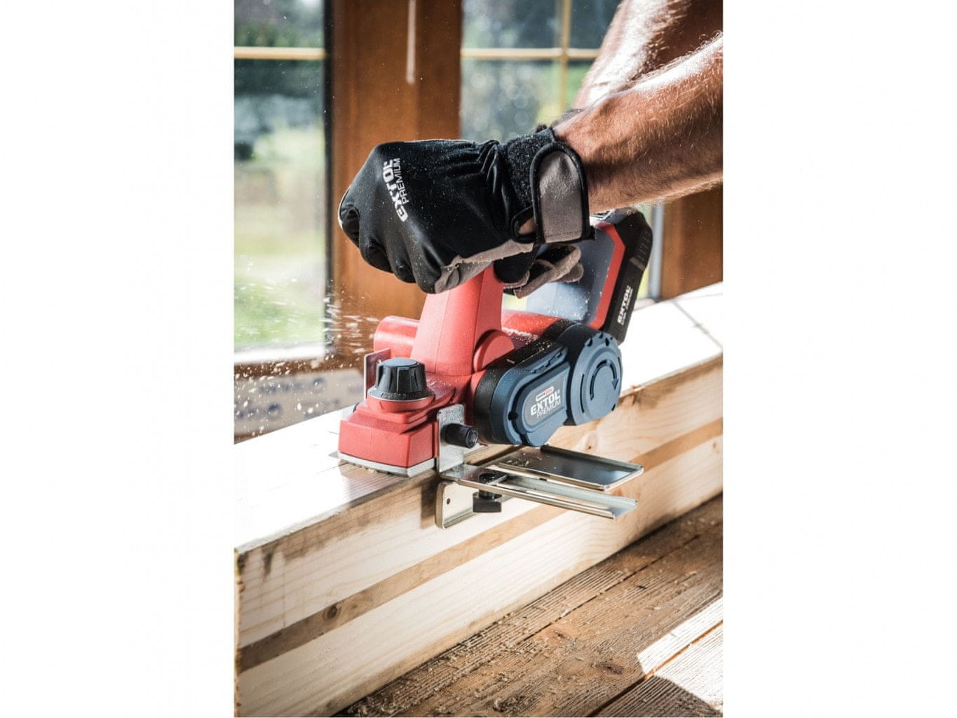 Akumulatorski skobeljnik Extol Premium združuje hitrost in moč električnega skobeljnika z udobjem akumulatorskega orodja. Rezultat je hitro in natančno odstranjevanje materiala brez oviranja kabla. Rezalna glava skobeljnika ima dve visokokakovostni rezili. Zaščitni trn v delovni plošči skobeljnika ščiti rezilo in obdelovani material, saj je rezilo med rezi dvignjeno in se ne dotika površine materiala. Zbiralna vreča, ki je pritrjena na izhod za prah, pomaga ohranjati delovno območje čisto in brez žagovine. Priloženi zložljivi nastavek pomaga ustvariti polovične utore na deskah, vzporedni nastavek pa ohranja skobeljnik na določeni razdalji. Za običajno delo zadostujeta ena ali dve 2000mAh bateriji, ki ju lahko hitro napolnite s hitrim polnilnikom, za zahtevnejše ali daljše delo pa priporočamo večje baterije s kapaciteto 4000–8000 mAh. Baterijo lahko uporabljate v vseh vrstah orodij EXTOL SHARE20V. Zaradi uporabljene litij-ionske tehnologije ga je mogoče kadar koli znova napolniti, ne da bi se zmanjšala njegova zmogljivost. Li-ionska baterija zelo počasi izgublja energijo zaradi samopraznjenja, zato je dolgo časa napolnjena in pripravljena za uporabo.