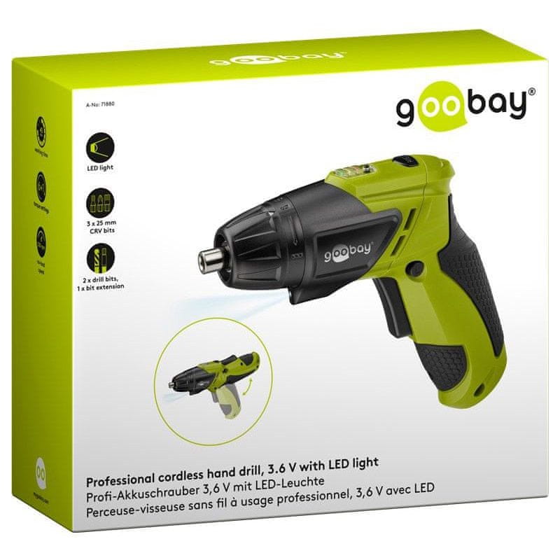 GOOBAY ročni baterijski vijačnik je nepogrešljivi pripomoček vsakega domačega mojstra! Je izredno prilagodljiv, saj lahko ročico zavrtite, da dosežete tudi težko dostopna mesta. Na voljo ima tudi LED lučko in indikator polnosti.