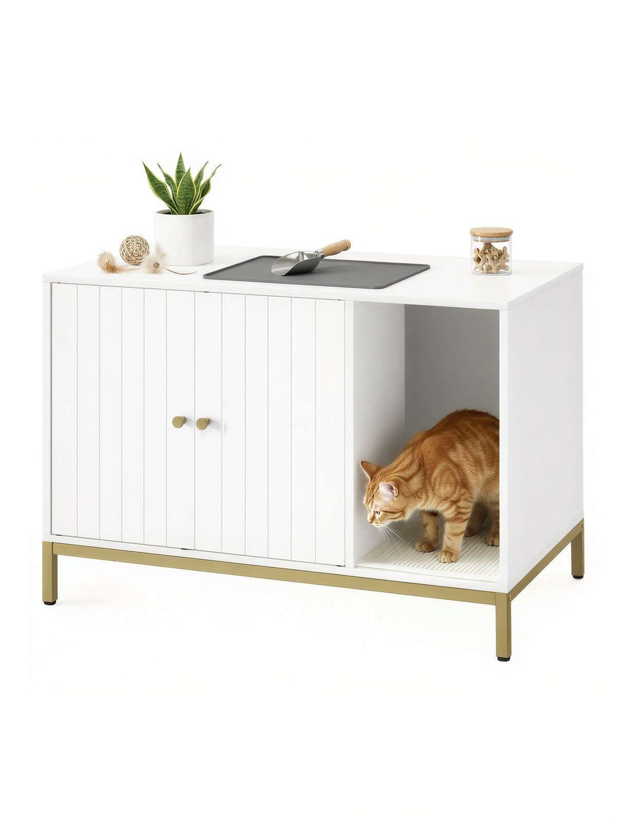 Ta večnamenski kabinet za mačji straniščni pesek je zasnovan tako da diskretno skriva mačje stranišče in se hkrati brezhibno zlije z vašim bivalnim prostorom. Lahko služi tudi kot stranska mizica ki ponuja tako funkcionalnost kot slog za lastnike hišnih ljubljenčkov. Dvignjene noge in priložena praskalna podloga zagotavljajo dodatno udobje in zabavo za vašega mačjega spremljevalca.