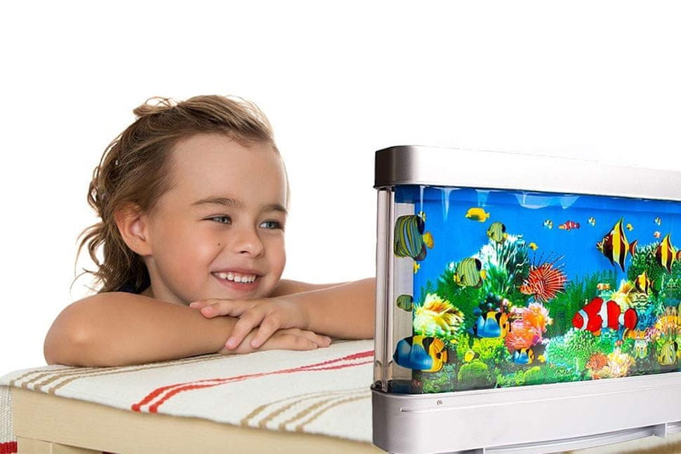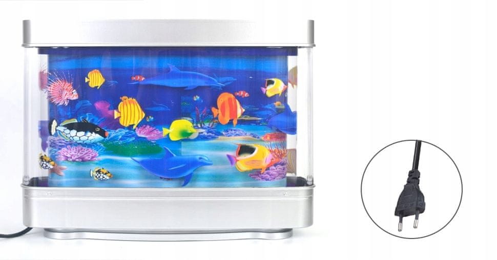 Dekorativna LED nočna svetilka v obliki umetnega akvarija. Naprava popolnoma posnema videz klasičnega akvarija z uporabo premikajočega se ozadja s tiskom. Zasnovan za postavitev na ravno površino. Svetilka uporablja svetlo, nevtralno belo LED osvetlitev ozadja. Napaja se neposredno iz električnega omrežja (ne zahteva stalne menjave baterij). Vgrajeno fizično stikalo za VKLOP/IZKLOP. Popolna kot sprostitvena lučka ali nočna svetilka v otroški sobi.