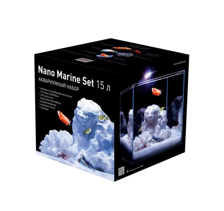 Nano Marine Set 15l Odlična izbira za majhne morske ribe, majhne kozice in rakce, morske polže, mehke in LPS korale. Najboljše za preprosto imitacijo morskega akvarija. Originalni notranji dodatek. Komplet vključuje: Akvarij – 15 litrski aGLASS iz ultra prozornega stekla.