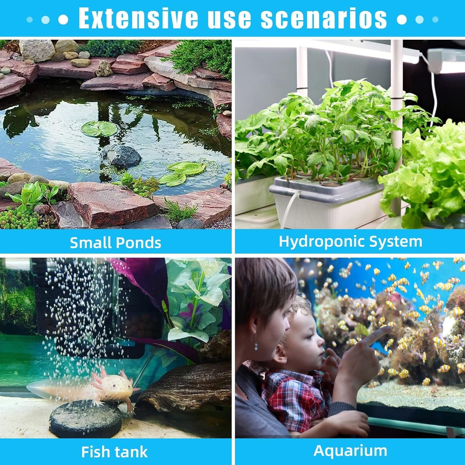 • Dodatki za akvarijske zračne črpalke: 1 × 100 mm disk z zračnimi kamni, 1 × 2 m standardna zračna cev, 1 x zračni kamen, 2 x nepovratna ventila, 3 x priseske, 1 x ravni konektor in 1 x T-konektor, celoten nabor orodij za prileganje vašemu akvariju. Naj vas ne skrbijo napačne nastavitve!