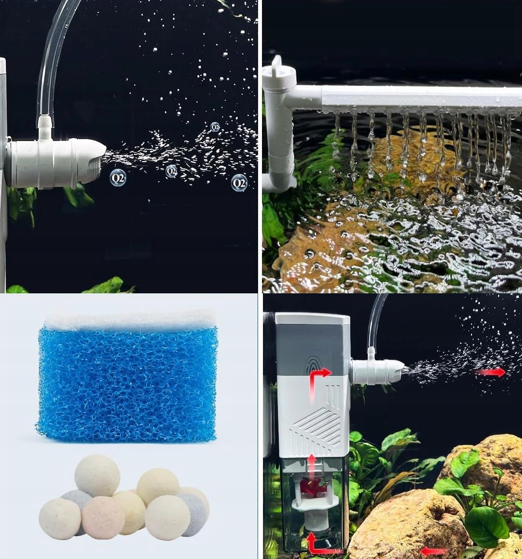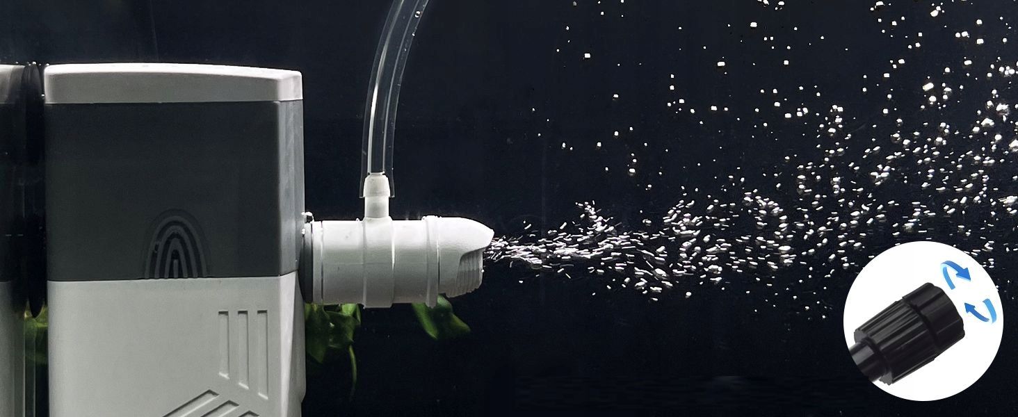•      Nastavljiv pretok vode: Večsmerne izhodne šobe so popolnoma nastavljive, da ustvarijo nežen curek vode, ki je varen za občutljive ribe ali kozice. Ta notranji akvarijski filter lahko ustvari obilo zračnih mehurčkov in pretok vode, kar je najboljše za obnavljanje kisika in kroženje vode v vašem akvariju. (Opomba: Zračni ventil mora biti izpostavljen zraku.)