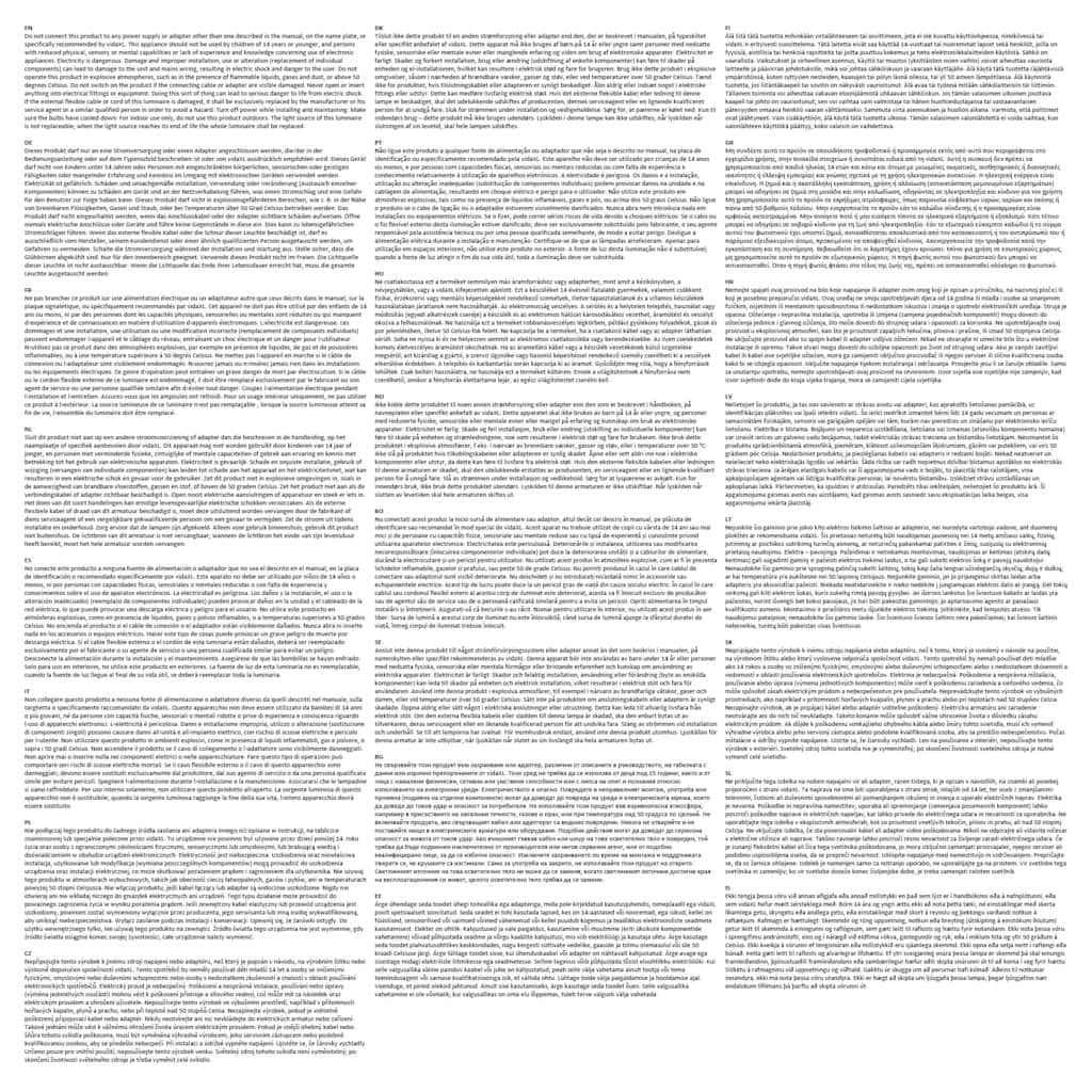 Ne priključite tega izdelka na noben napajalni vir ali adapter, razen tistega, ki je opisan v navodilih, na znamki ali posebej priporočeni s strani vidaXL. Ta naprava ne sme biti uporabljena s strani otrok, mlajših od 14 let, ter oseb z zmanjšanimi telesnimi, čutnimi ali duševnimi sposobnostmi ali pomanjkanjem izkušenj in znanja o uporabi električnih naprav. Elektrika je nevarna. Poškodbe in nepravilna namestitev, uporaba ali spreminjanje (zamenjava posameznih komponent) lahko povzroči poškodbe naprave in električnih napeljav, kar lahko privede do električnega udara in nevarnosti za uporabnika. Ne uporabljajte tega izdelka v eksplozivnih atmosferah, kot so prisotnost vnetljivih tekočin, plinov in prahu, ali nad 50 stopinj Celzija. Ne vključujte izdelka, če sta povezovalni kabel ali adapter vidno poškodovana. Nikoli ne odpirajte ali vstavite ničesar v električne vtičnice ali naprave. Takšno ravnanje lahko povzroči resno nevarnost za življenje zaradi električnega udara. Če je zunanji fleksibilni kabel ali žica tega svetilnika poškodovana, jo mora izključno zamenjati proizvajalec, njegov serviser ali podobno usposobljena oseba, da se prepreči nevarnost. Izklopite napajanje med namestitvijo in vzdrževanjem. Prepričajte se, da so žarnice ohlajene. Izdelek je namenjen samo za notranjo uporabo, ne uporabljajte ga na prostem. Vir svetlobe tega svetilnika ni zamenljiv; ko vir svetlobe doseže konec življenjske dobe, je treba zamenjati celoten svetilnik.