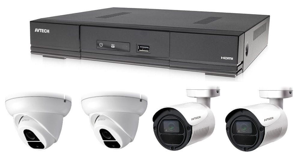Stroškovno ugoden komplet kamer vsebuje 1× snemalno napravo AVTECH DGD1005AV DVR, 2× HDCCTV 2MPX Dome kamero AVTECH DGC1004XFT, 2× HDCCTV 2MPX Bulet kamero AVTECH DGC1105YFT in 2× napajalnik OXE 19026.