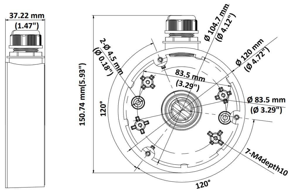 Namestitvena škatla za kupolaste kamere Hikvision serije D7×x. Škatla je primerna za notranjo in zunanjo uporabo. Stena mora podpirati več kot 3-kratno skupno težo kamere in nosilca.