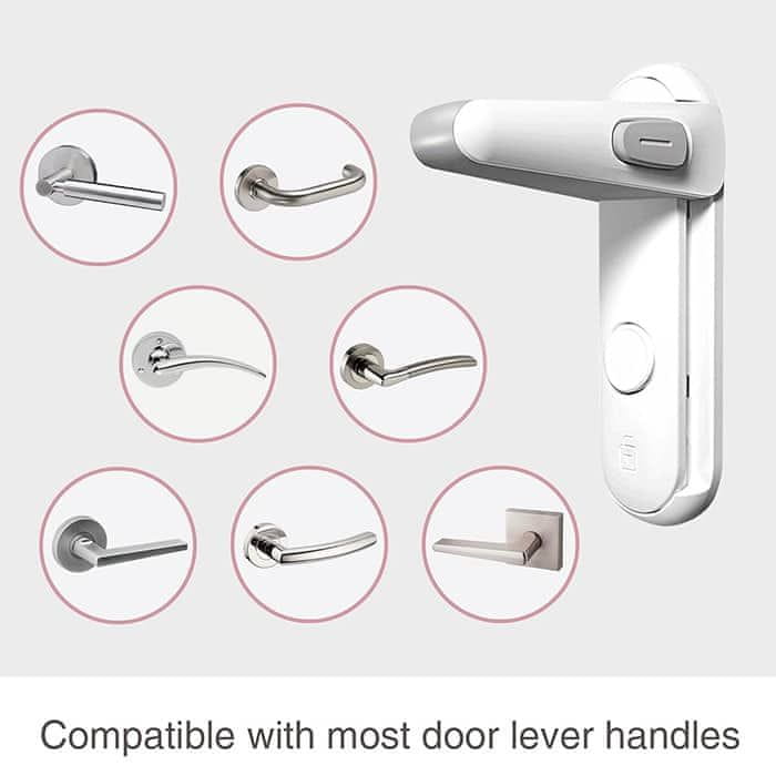 • Uporaba: Namestite tako, da odlepite zaščito in pripomoček nalepite na mesto pod kljuko. Priporočamo, da počakate 24 ur pred prvo uporabo. Ko je izbočeni del varovala spodaj, se vrata lahko odpirajo, ko pa je ta del varovala nameščen na zgornjem delu, se vrata ne morejo odpreti, saj se kljuka zaustavi. Izbočeni del premikate tako, da hkrati stisnete stranska gumba in ga pomaknete navzgor ali navzdol.