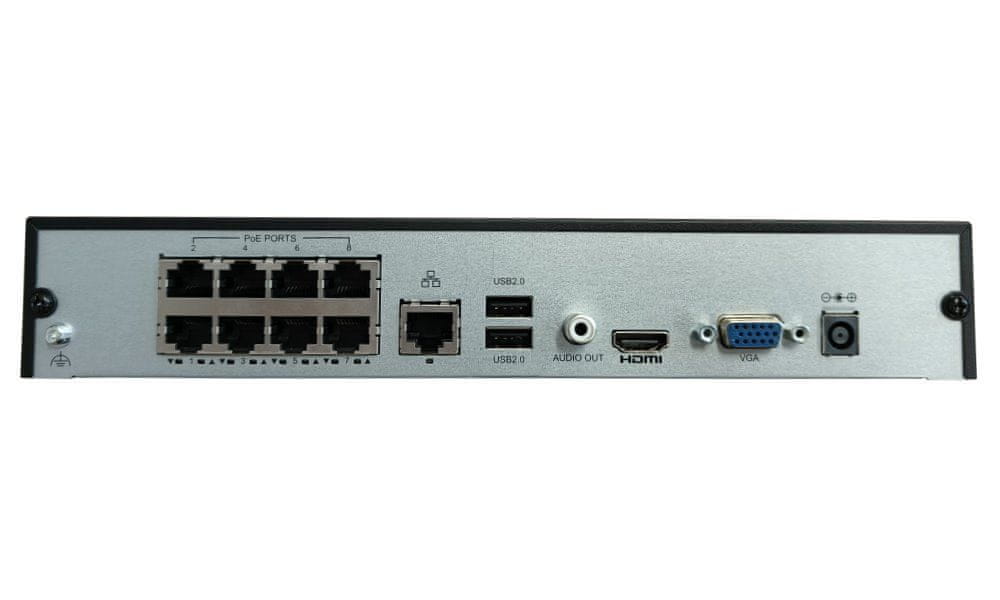 Naprava za snemanje za 8 kamer IP. Dovoljene so kombinacije različnih ločljivosti do 8 Mpx in bitne hitrosti do 50 Mb/s. Naprava podpira standard ONVIF (profili S, G, T) in tudi dekodiranje Ultra 265, s katerim lahko prihranite do 75 % količine podatkov. Na voljo je eno mesto SATA za trdi disk do 6 TB.