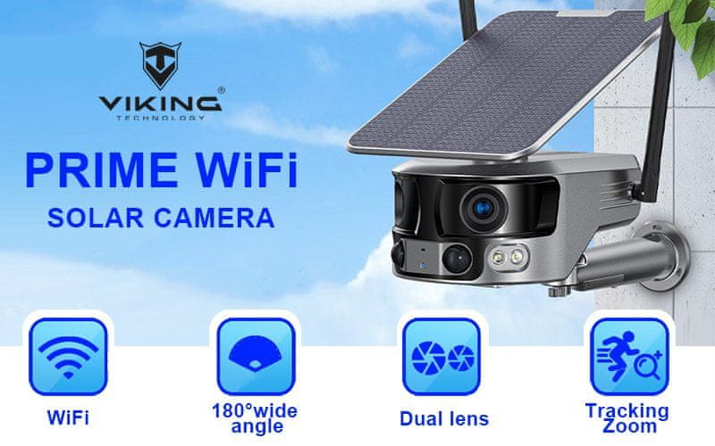 Solarna kamera Viking PRIME-WiFi ima panoramski objektiv s 180° vidnim kotom, zaščito IP66 (velja le, če so vsi vhodni in izhodni priključki pokriti npr. s silikonskim zaščitnim pokrovom), senzor PIR, zaznavanje gibanja ljudi in nočni vid. Na kamero je mogoče priključiti tudi zmogljiv solarni panel, zaradi česar je kamera neodvisna od električnega omrežja.