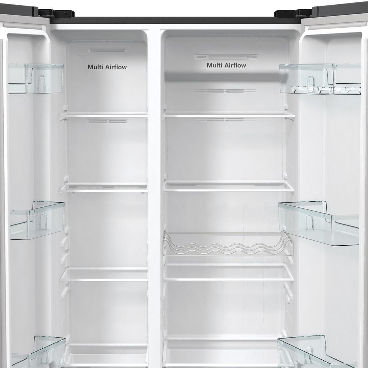 Ameriški hladilnik z zamrzovalnikom Hisense RS711N4AFE spada v energijski razred E. Ponaša se s skupno 505 litri prostornine, od tega je 358 litrov prostornine v hladilnem delu in 192 litrov v zamrzovalnem delu. Zahvaljujoč 90-stopinjskemu kotu odpiranja vrat in globino, ki se ujema z globino kuhinjskega pulta, je ta prostostoječi hladilnik idealen za vsako sodobno opremljeno kuhinjo.