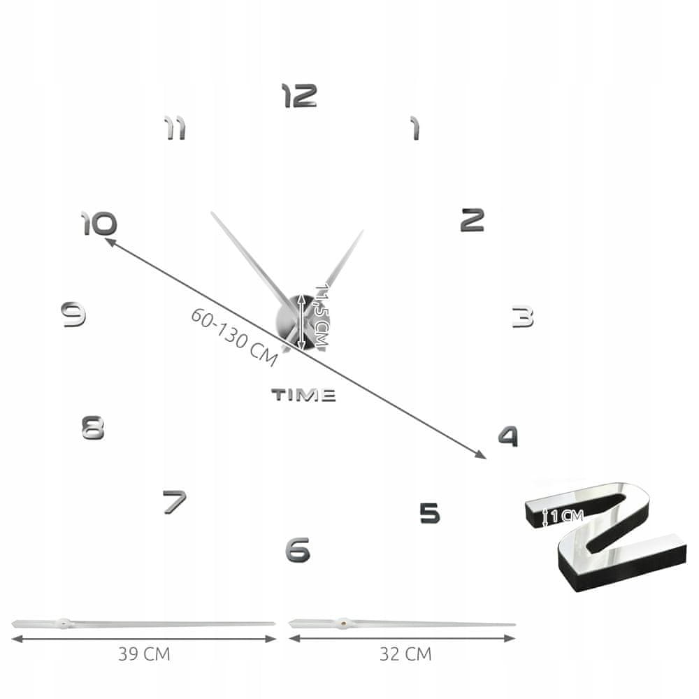 Samosestavljiva ura ima čudovit in zelo impresiven zrcalni učinek visokega sijaja. Ura najbolje izgleda s premerom od 60 (kazalci blizu številk) do 130 cm. Posamezne številke se pritrdijo s priloženim samolepilnim trakom. Ura se prilega vsaki barvi stene. Številke lahko razporedite poljubno – klasično v krog ali z vrtenjem/premikanjem, da ustvarite nepravilno kompozicijo – vse je odvisno od vas!