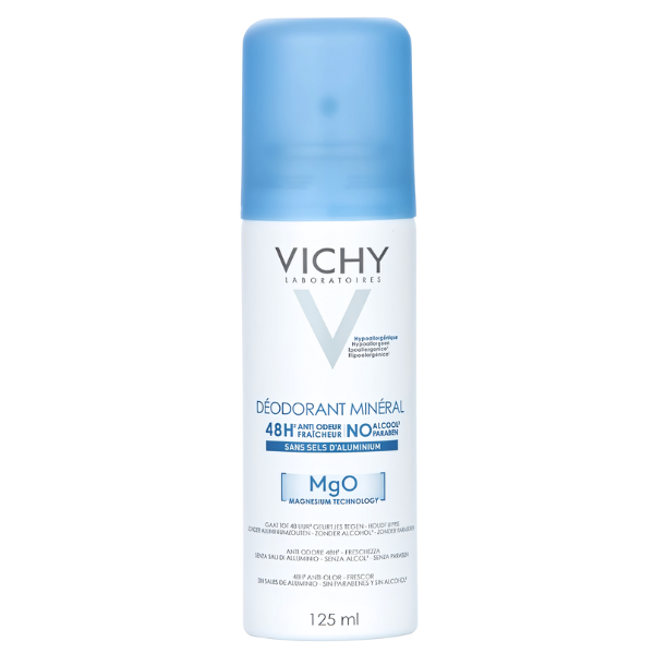 Vichy Mineral 48h je inovativen deodorant v aerosolu , ki zagotavlja učinkovito zaščito pred potenjem in neprijetnim vonjem 48 ur. Zahvaljujoč nežni formuli, obogateni s termalno vodo Vichy in minerali, ki krepijo kožo, izdelek ščiti in neguje pazduhe. Ne vsebuje aluminijevih soli, alkohola in parabenov, zato je primeren tudi za občutljivo kožo.