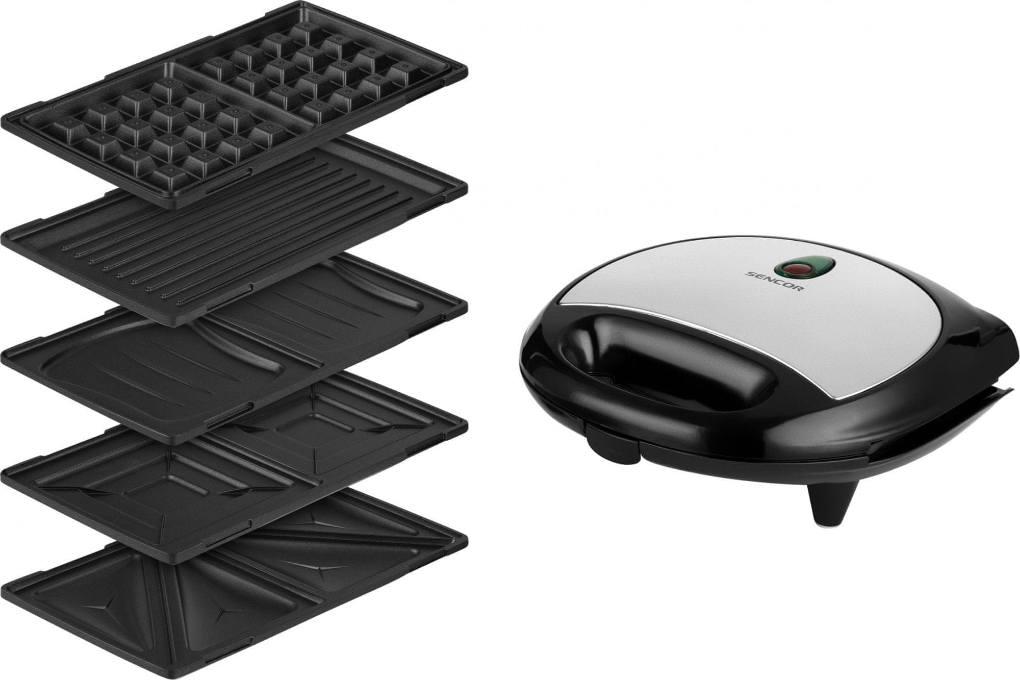 5 v 1 kuhinjski aparat za pripravo sendvičev, peko mesa na žaru ali peko vafljev. SENCOR SSM 9510SS je opremljen s 5 zamenljivimi ploščami s površino, ki se ne prijema. Naprava ima toplotno izoliran ročaj in ohišje, indikator delovanja in toplote ter varnostno toplotno varovalko. Celoten opis