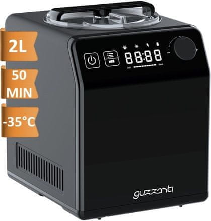 Guzzanti GZ 155A je zmogljiv in uporabniku prijazen aparat za sladoled za gospodinjstva, ki zaradi kompresorja in odstranljive posode omogoča hitro pripravo kremastega sladoleda brez kakršne koli priprave koraki. Integrirani programi in vzdrževanje hladilnega sistema povečajo udobje in zanesljivost rezultata.