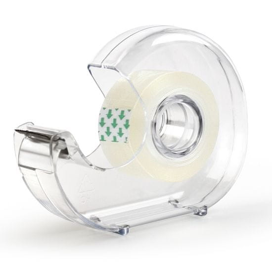 Dozator s kristalnim trakom 19 mm x 33 mm. Trak je odporen na rumenenje, neviden na fotokopijah. Dozator ima kovinske zobe za rezanje traku. Popolnoma nov, tovarniško pakiran izdelek. Po porabi traku lahko kupite novega in ga namestite v dozator. Visoka natezna trdnost.