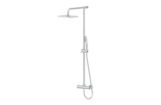ELEGANTNA KOPALNIŠKA SAMOSTOJEČA, TERMOSTATSKA ARMATURA ZA TUŠ V KROM BARVI. KOMPLET VKLJUČUJE GIBLJIVO CEV, ROČNO PRHO, DRŽALO ZA ROČNO PRHO, ZIDNO PRHO IN EKSCENTRA