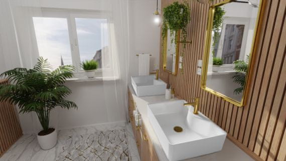 • Enoročna kopalniška armatura Alvito GLAM Gold je popoln kontrast z belino keramike.