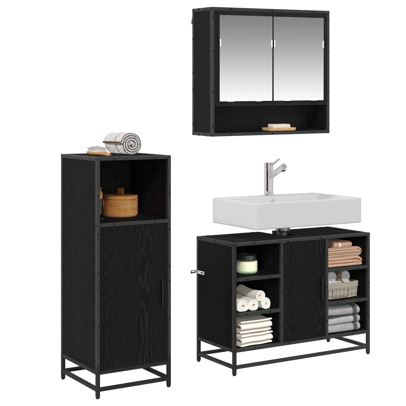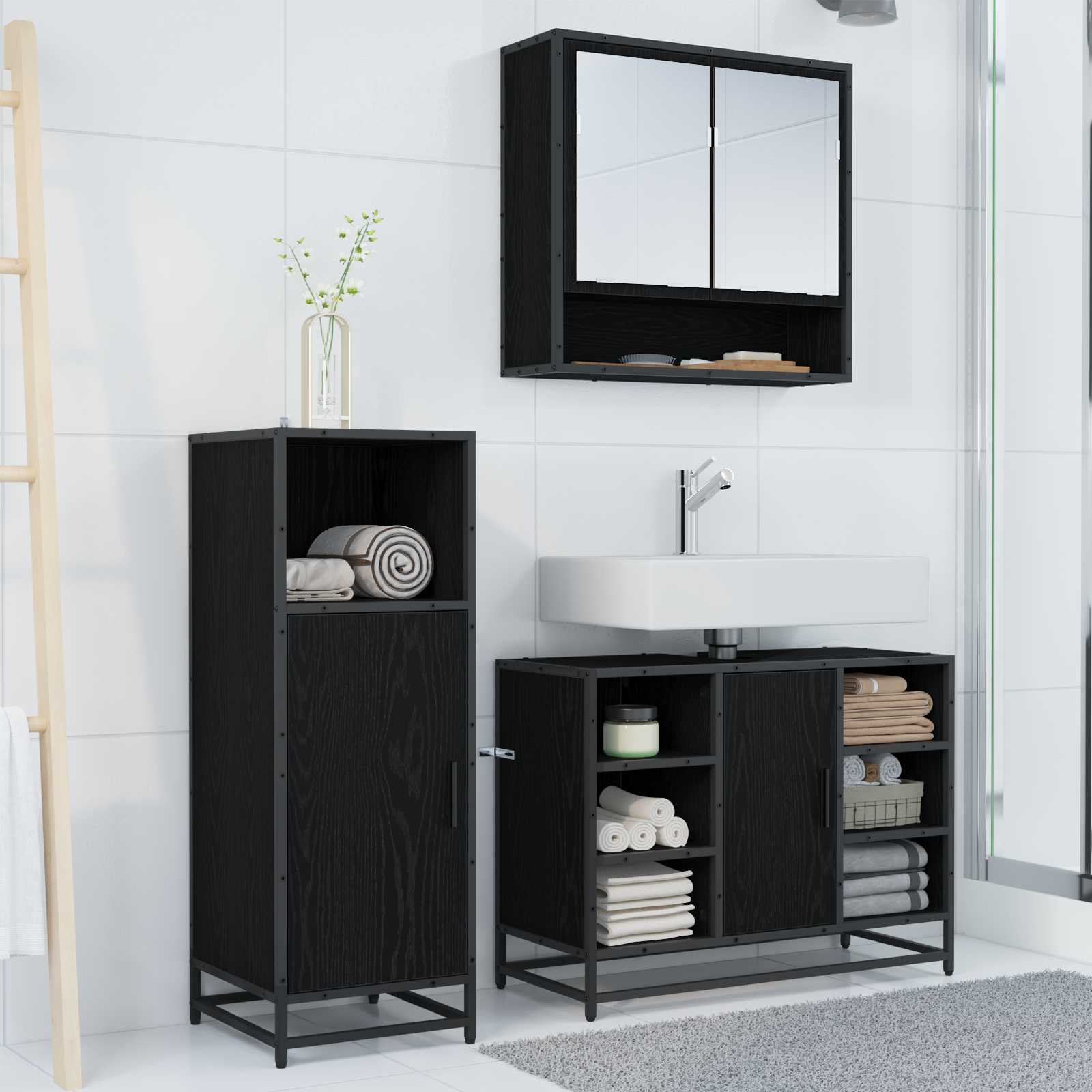 Ta moderni set kopalniškega pohištva združuje slog in funkcionalnost ter je idealen za raznolike kopalniške dekorje. S svojimi elegantnimi pravokotnimi oblikami in minimalističnimi podrobnostmi vsebuje ogledalno omarico, umivalniško omarico in visoko omarico, vse izdelane iz inženirskega lesa za stilno in trajno rešitev shranjevanja. Črne kovinske noge seta nudijo močno oporo in odražajo sodobno estetiko, kar ga dela idealnega za vse, ki iščejo kombinacijo stila in funkcionalnosti v svoji kopalnici.