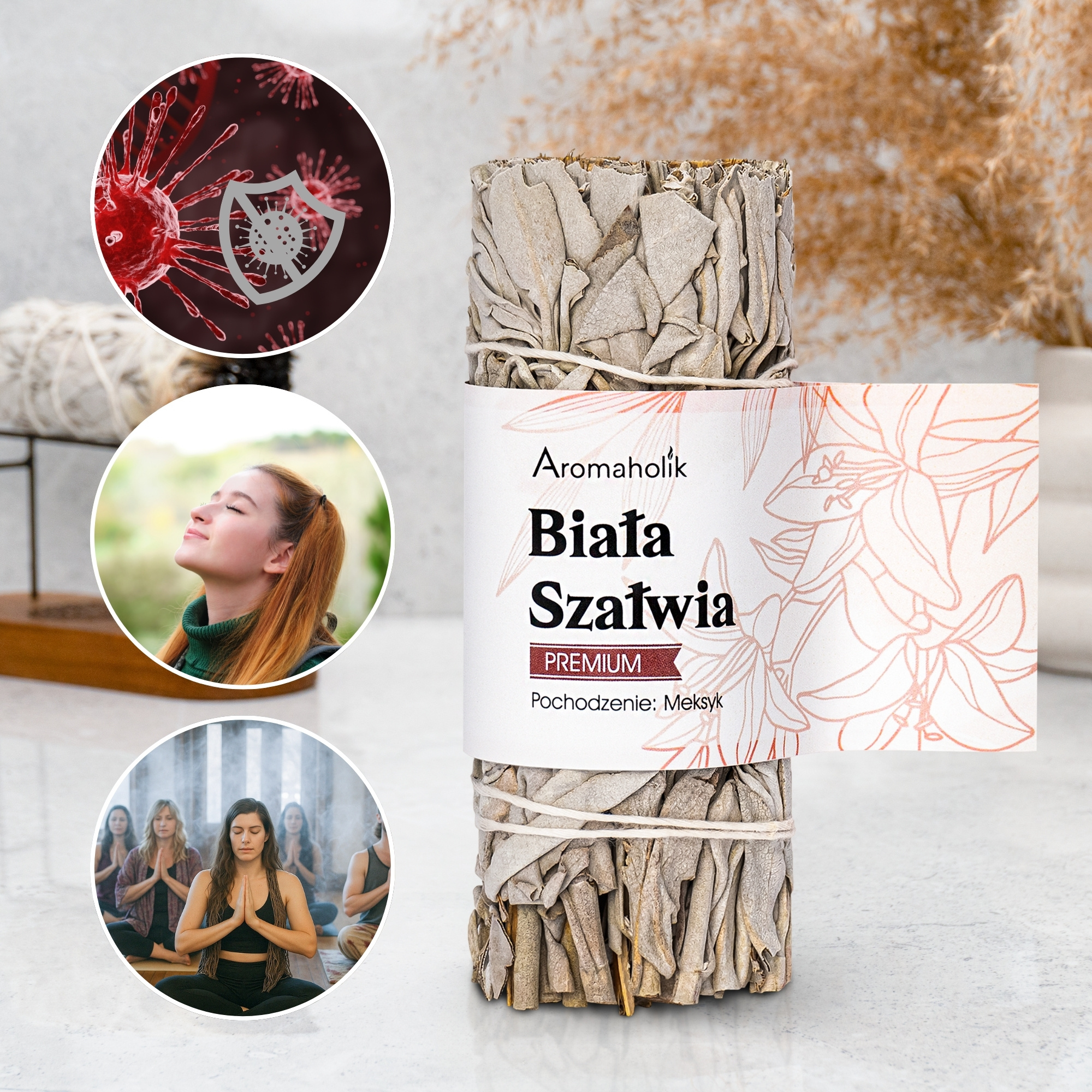 antiseptične lastnosti, nevtralizira vonjave in izboljšuje kakovost zraka. V aromaterapiji je beli žajbelj znan po svojih pomirjujočih učinkih – njegov intenziven, zeliščni vonj spodbuja meditacijo in delo z namenom. Spoštovanje tradicije Vsak šopek belega žajblja je ročno vezan po tradicionalnih metodah