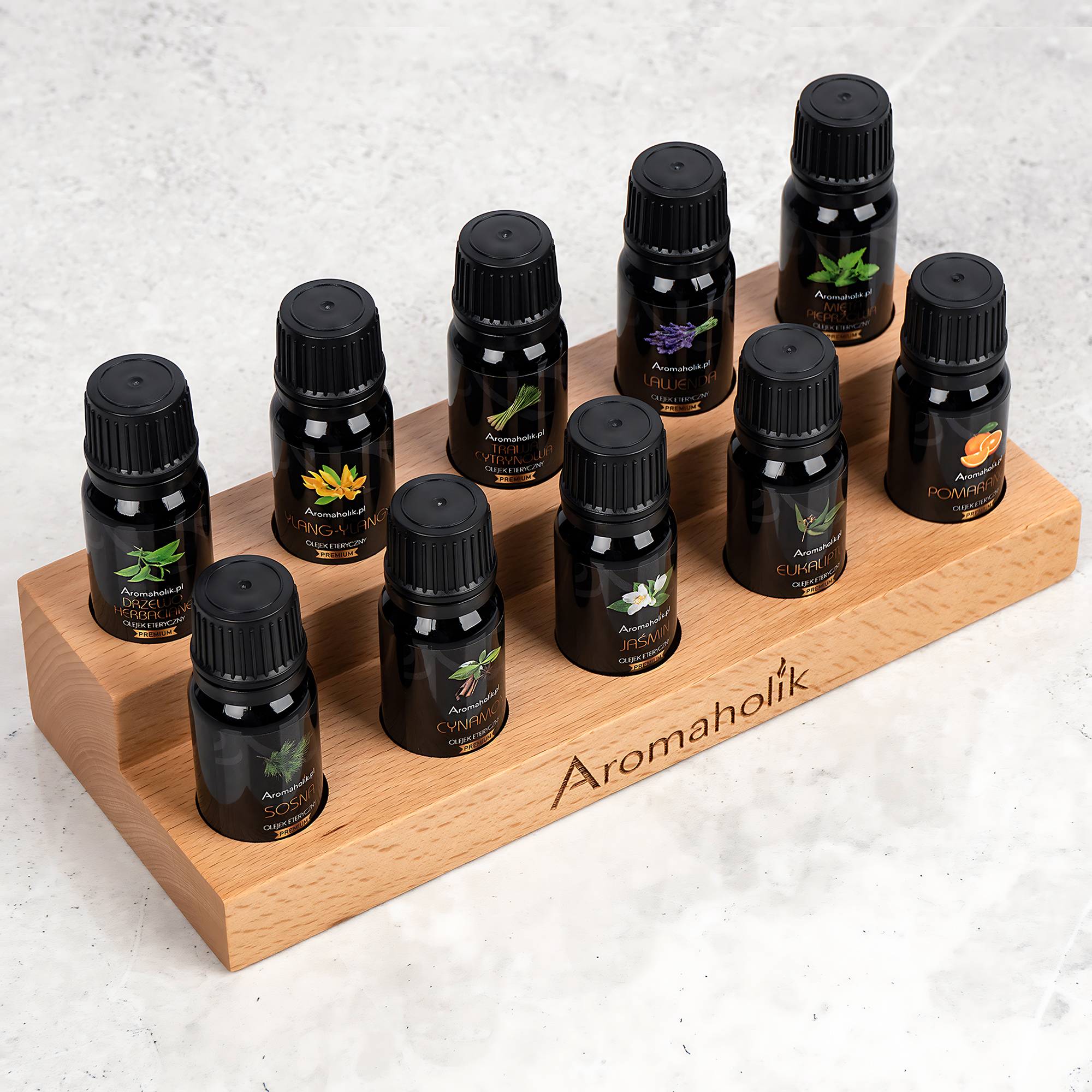 Leseno stojalo Aromaholik – elegantno stojalo za 10 olj, ki organizira in lepo razstavi vašo zbirko.