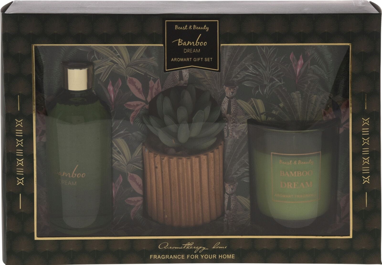Komplet dišav za dom: Vonj v prostoru igra ključno vlogo, zato se splača imeti komplet dišav, da boste vsak dan uživali v prijetni aromi. Komplet vsebuje svečo, difuzor dišav s trstikami in umetno rastlino. Zaradi estetskega videza izdelkov v kompletu jih je mogoče postaviti v kateri koli prostor kot dodatno dekoracijo. Difuzor vam lahko pomaga pri sprostitvi, oddihu in izboljšanju počutja. Komplet, pakiran v elegantni obliki, je odlična ideja za darilo! Komplet vsebuje: difuzor dišav s trstikami, dišečo svečo in umetno rastlino (sukulento). Prednosti: Visokokakovostna izdelava – izdelki so izdelani iz trdnih in trpežnih materialov, kar zagotavlja dolgotrajno uporabo. Elegantna oblika – komplet se dopolnjuje z različnimi notranjimi dizajni, od klasičnih do bolj modernih, in doda toplino. Komplet je zelo enostaven za čiščenje, kar pomaga ohranjati čistočo in brezhiben videz. Parametri: Material: Steklo, parafin, plastika Barva: Večbarvna Dišava: „Zver in lepota“; „bambusove sanje“; „bukthorn pine“ Dolžina kompleta: 24,5 cm Širina kompleta: 6,5 cm Višina kompleta: 17 cm Uporaba: Dekoracija doma, difuzor dišav Cena velja za en komplet (sveča, umetna rastlina, difuzor dišav s palčkami) Izdelek je na voljo v več različicah. Prosimo, da v opombah naročila navedete vonj, sicer ga bomo izbrali mi.