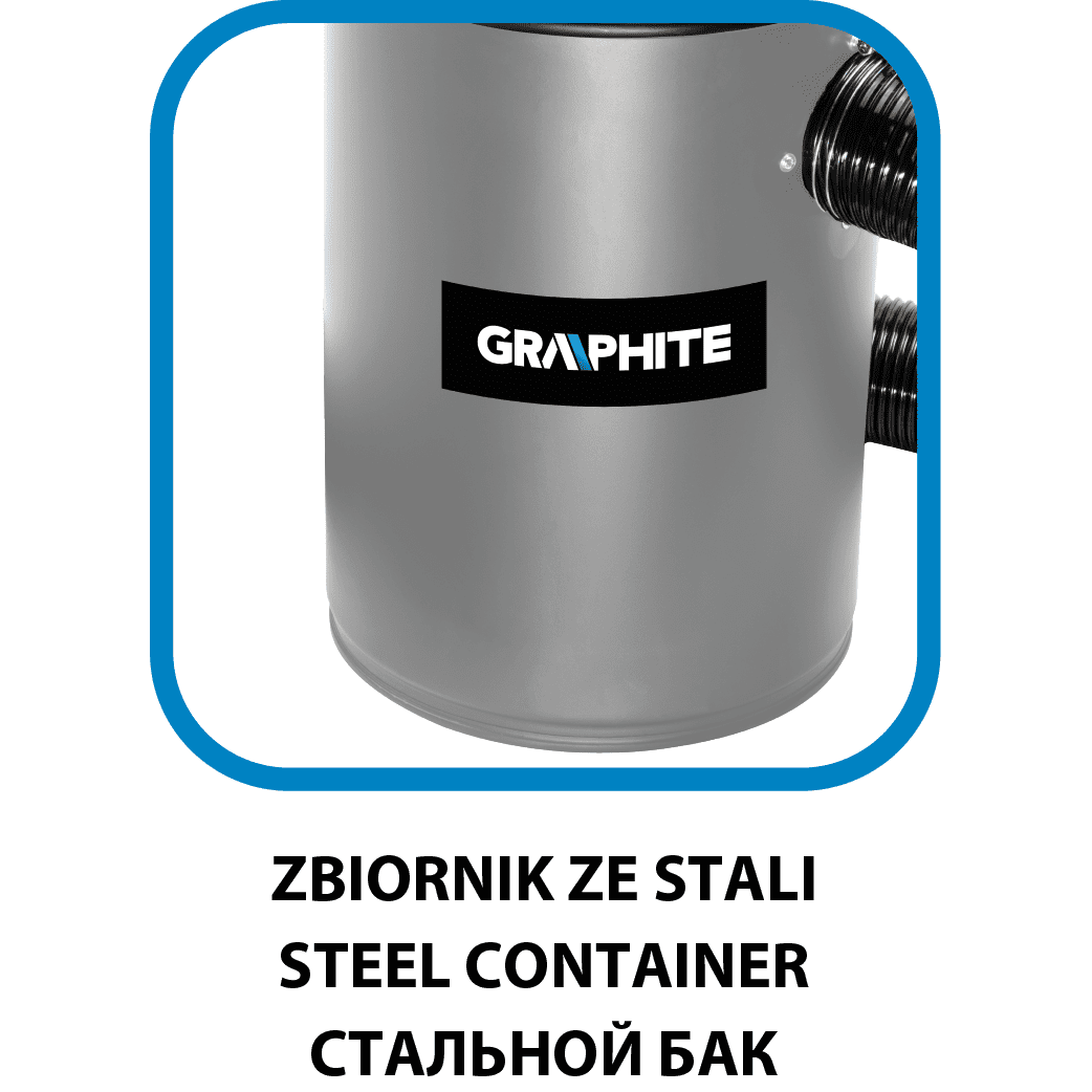 Sesalnik za sekance in žagovino GRAPHITE 1100 W, 50 L, 59G611 je naprava z motorjem z močjo 1100 W in sesalno močjo 2,5 kPa. Opremljen je s 50-litrskim rezervoarjem in zagotavlja veliko zmogljivost brez pogostih prekinitev. Sesalnik je opremljen z 2-metrsko sesalno cevjo. Naprava meri 400 × 660 × 4000 mm in tehta 9 kg. Priporočljiv je za sesanje prahu, sekancev in žagovine. Nepogrešljiv bo v vsaki lesarski delavnici.