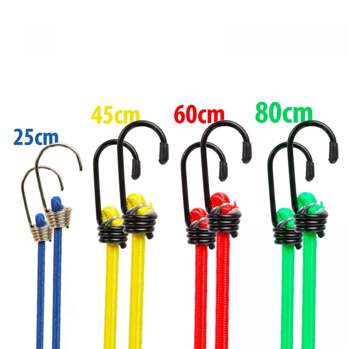 Set vključuje: 2 kos trak s zaponko – 25 mm x 2,5 m (max 250 kg)1 kos traku brez kljuke – 25 mm x 5 m (največ 500 kg)1 kos traku s kavljem – 25 mm x 5 m (največ 450 kg)2 kos bungee vrvica – 8 mm x 45 cm2 kos bungee vrvica – 8 mm x 60 cm2 kos bungee vrvica – 8 mm x 80 cm2 kos bungee vrvica – 4 mm x 25 cm
