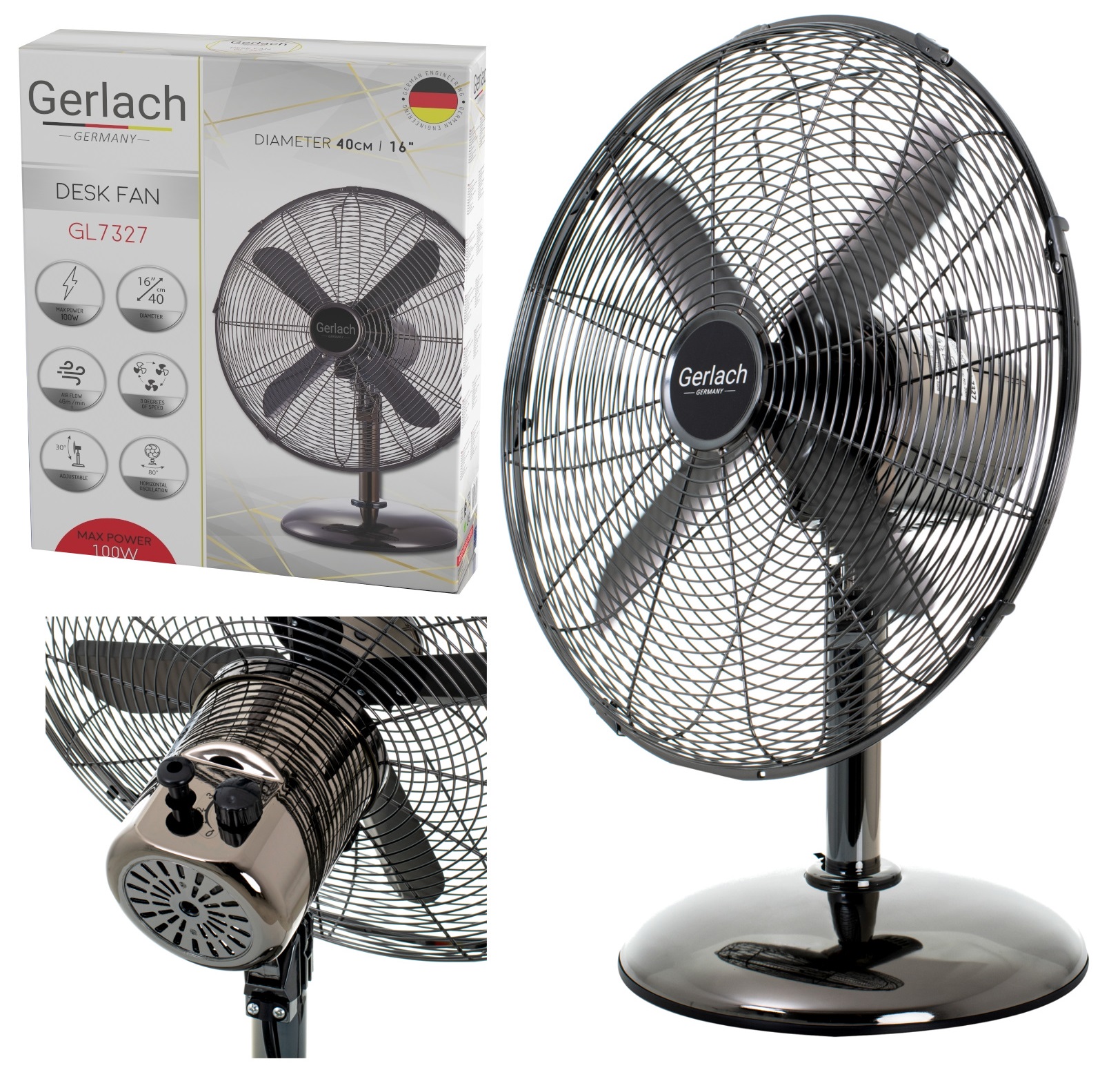 Učinkovit namizni krožnik zraka Gerlach 7327 s kovinskim propelerjem s premerom 40 cm/16" zagotavlja prijeten pretok hladnega zraka. Cirkulator je enostaven za uporabo in vsestranski zahvaljujoč 3 razponom hitrosti in nastavljivemu kotu nagiba. Opremljen je s stabilno podlago in vodoravnim nihanjem 80° ter ima moč 100 W.