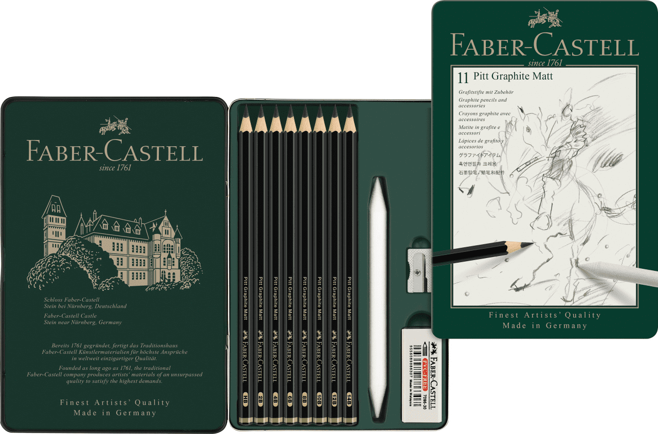 Pitt grafitni mat svinčniki FABER-CASTELL so revolucija v risanju z grafitom! Inovativni Pitt grafitni mat je bil posebej zasnovan za zmanjšanje odbojev svetlobe na papirju in ustvarjanje učinka največje globine , zahvaljujoč različnim stopnjam trdote. To so izjemno mat, vrhunski grafitni svinčniki za umetnike.