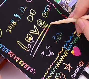 Za pisanje po črnih listkih je idealno belo, zlato ali srebrno pisalo ali flomaster. Rišete lahko tudi z barvicami, pasteli ali flomastri – v pastelnih ali kovinskih barvah.