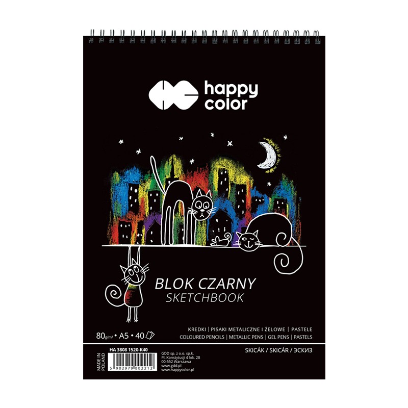 Spiralni blok Happy Color s črnim papirjem ‚MAČKE‘. 40 listov formata A5. Teža 80 g.